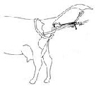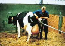 This Calfpuller is easy to handle. The rump frame is placed over the cow's rear with the open end towards the backbone. Then the ropes are attached to both calf's legs and to lever mechanism in that order. Now gently tension the ropes and it will adopt the correct position whether the cow is standing up or lying down.