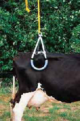 Bring the apparatus around the hips of the animal as visible in the picture. Turn the spindle tight. Lift the animal slowly up so that it can stand up easily. As soon as the animal is standing, take the tension off the cable. Now the apparatus will hold the animal so that it does not fall sideways. It does not make sense to put animals in the apparatus for a longer time, if they cannot stand up at all. It is important to turn these animals every three hours on their other side. It is constructed so that with proper use, it will not cause bruising around the hipbone.